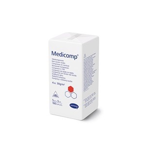 Compresse en non-tissé constituée d'un mélange de fibres de viscose et de polyester. Elle est exempte de liants ainsi que de correcteurs optiques, et perméable à l'air, disponible en quatre plis. Les compresses peuvent être dépliées pour obtenir des tailles plus grandes. Les dispositifs stériles sont emballés dans des pochettes en papier-film. Les produits non stériles sont emballés dans des pochettes en papier.
